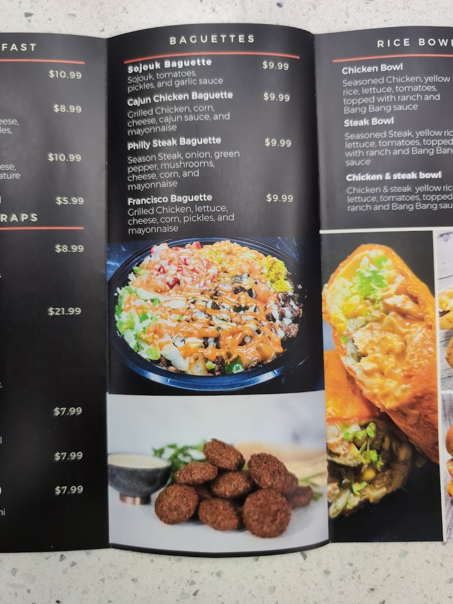 The Baguettes on the menu stand out as comforting and flavorful choices. The Francisco Baguette is a favorite, and the Philly Steak Baguette is perfect for fans of savory, tender steak. For something with a Cajun flair, the Cajun Chicken Baguette brings just the right amount of spice and flavor. Of course, for fans of Mediterranean flavors, the Sojouk Baguette offers a unique twist on traditional fillings.